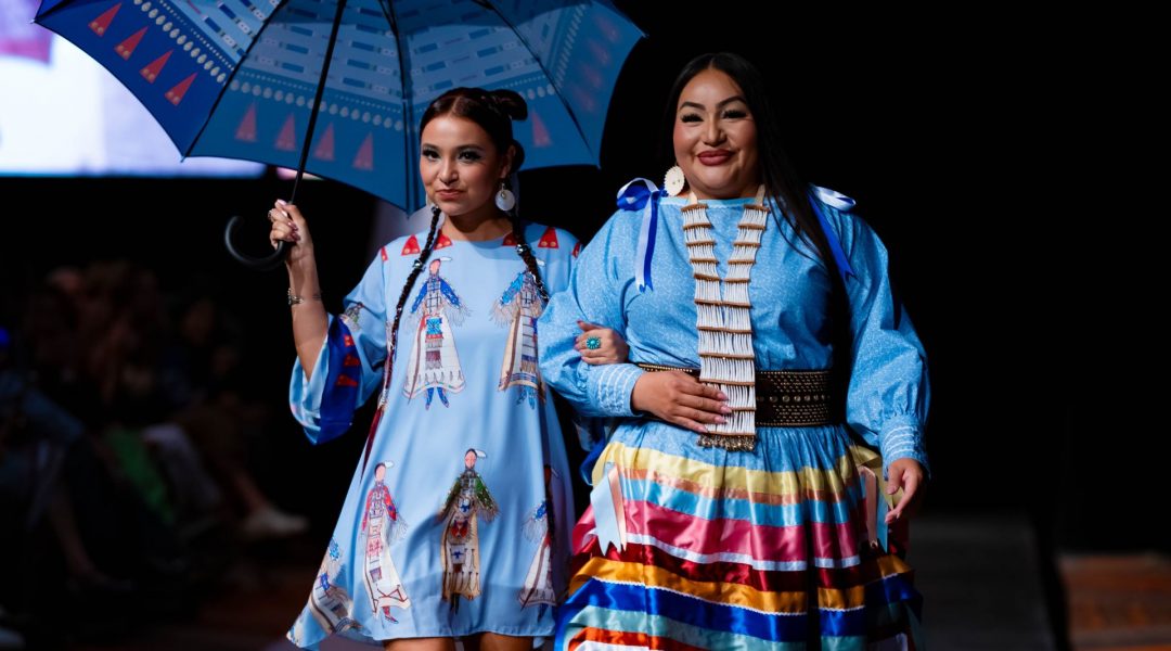 The main event kicked off on Friday night, when the Santa Fe Convention Center came alive with fashion shows from Dancing Storm Designs, Stitched by April, Dene Couture, Sage Mountainflower, Randi Nelson Designs, and Lauren Good Day. The final show included a spirited performance by Reservation Dogs rapper Mato Wayuhi (Oglala Lakota) and appearances by celebrity models like Cree hoop dancer James Jones, aka Notorious Cree.