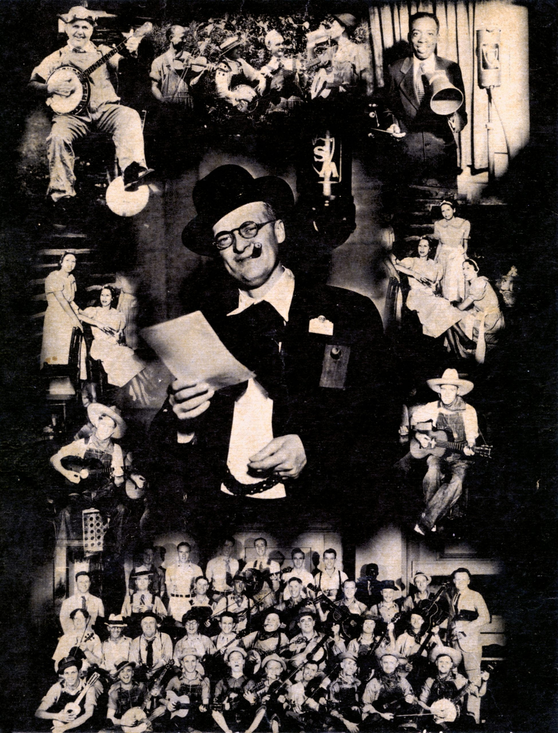 Advertising postcard depicting Grand Ole Opry creator George D. Hay, surrounded by images of early performers, mid-1930s.