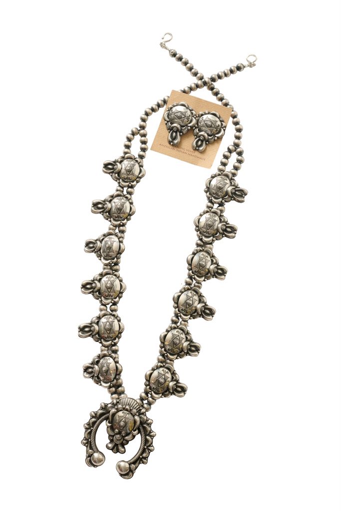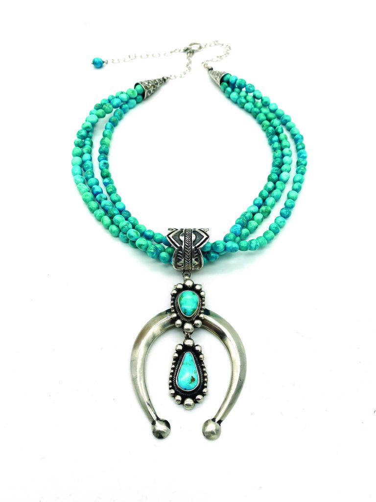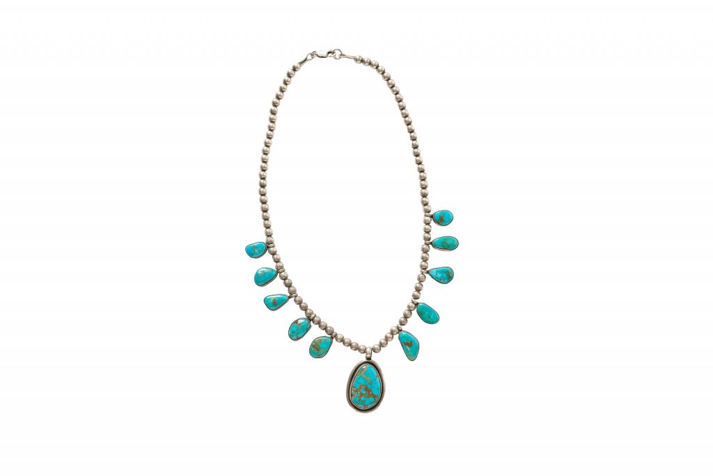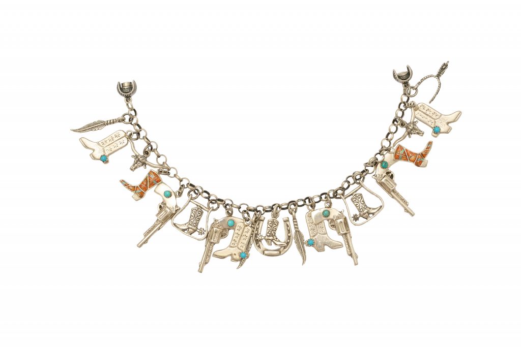 [1] Cowgirl charm bracelet, danavoorhees.com; [2] Chantecler Enchanté lobe turquoise and diamond earrings, jacksonholejewelry.com; [3] Double circle mountain engraved silver earrings, blingboheme.com; [4] Ride Tall in Your Saddle earrings, tresmelindas.com; [5] Delbert Gordon (Navajo) sterling squash blossom set, coloradojo.com; [6] Navy Spinel and Tahitian multi-strand necklace, pearlsbyshari.com; [7] Darryl Becenti (Navajo) Picasso cuff, coloradojo.com; [8] Isiah Begay (Díne Navajo) Mosaic curved inlay tufa cast cuff, samsvillegallery.com; [9] Vintage 11 stone necklace, jewelrylady.co; [10] Sonoran Mountain Turquoise Naja necklace, sylviamjewelry.com.