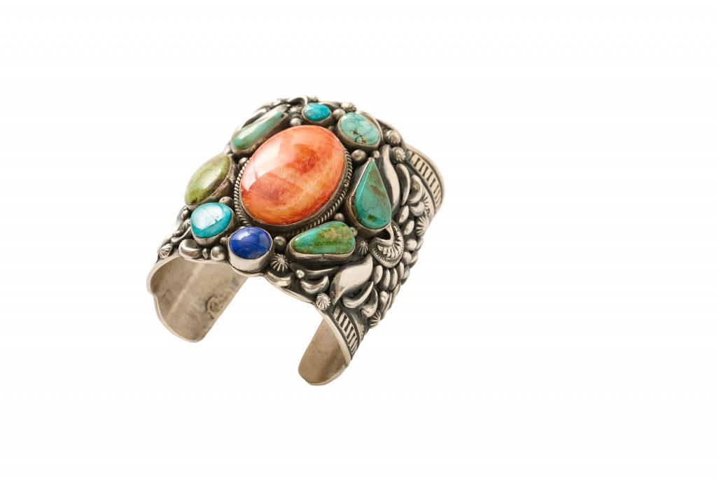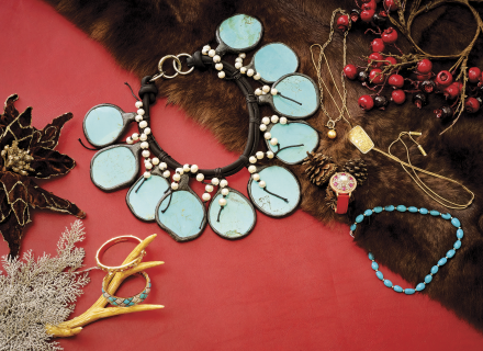 LEAD PHOTO: [Left to right] Leigha Cleveland (Navajo) CoJo collective turquoise ring, coloradojo.com; Spirit Pony pendant on Navajo pearls, wildatheartsilver.com; Leo Feeney coral beaded necklace, samsvillegallery.com; Fur collar, caseycurtisdesigns.com; Classic rope and scroll ring, hyosilver.com; Bison Lion fringe choker, leathersage.com; Red Mountain sterling silver and rosarita stone earrings, desire2b.com; White Buffalo with red coral wildflowers cuff, wildatheartsilver.com; Margaret boots, paulbondboots.com; The Blair Polished cuff, vogtsilversmiths.com.
