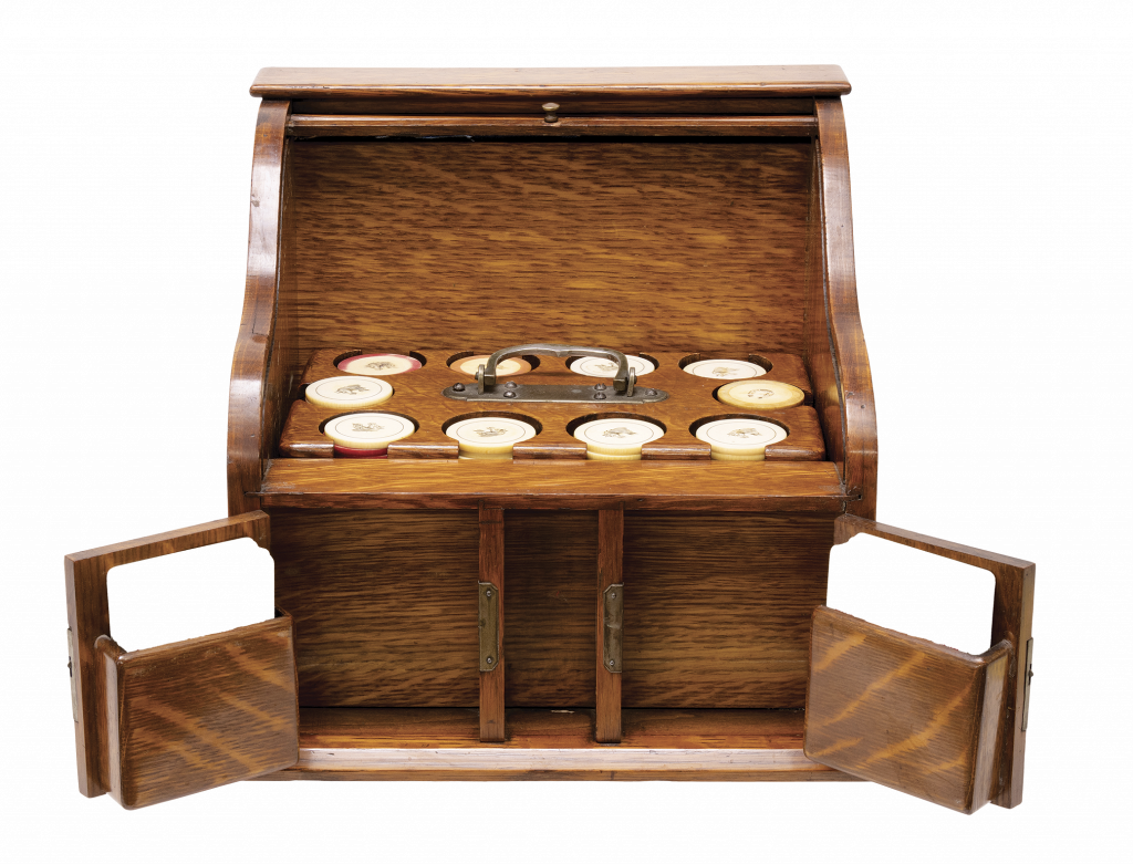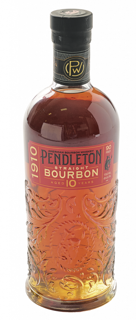 [1] Oak poker case with ivory chips, ciscosgallery.com; [2] Leather Vintage Label cologne, truwestern.com; [3] Pistol case with cowhide and Pendleton wool, kls-designs.com; [4] Pendleton 1910 Bourbon, store.pendletonwhisky.com; [5] Leather Weekender duffel bag, tombeckbe.com.