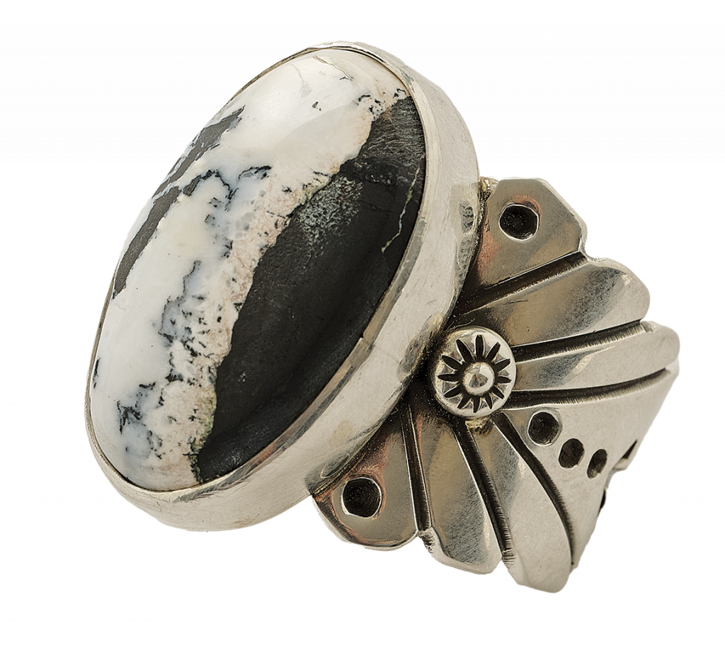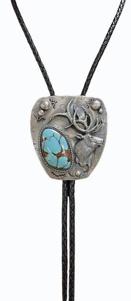 [1] Cheyenne paisley wild rag, cowboywildrags.com; [2] FOPE EKA 18k gold Flex’It bracelet with black diamond, jacksonholejewelry.com; [3] Call of the Wild bolo, highdesertcreations.com; [4] Tahitian pearl and leather bracelet, pearlsbyshari.com; [5] Regina Smart (Choctaw) Indian Chief ring, cowboyjewelers.com; [6] Engraved Copper Energy cuff, hyosilver.com; [7] White Buffalo ring, wildatheartsilver.com.