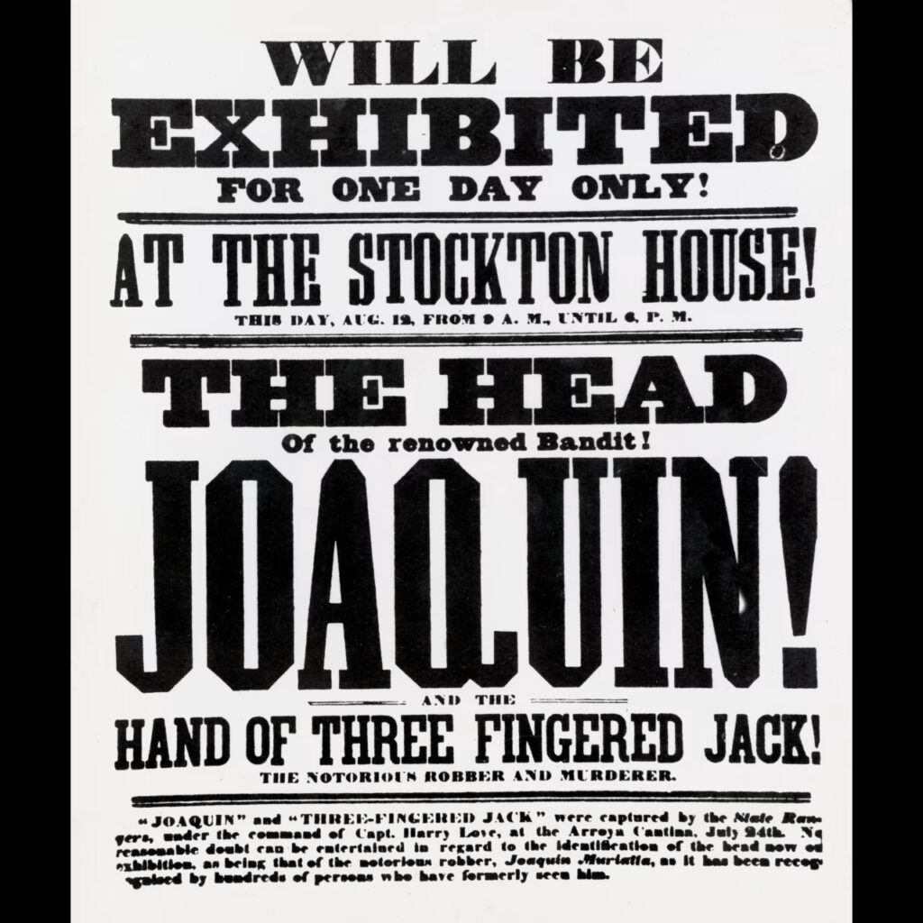 Boessenecker: What happened was this bandit rage just terrorized the mining country in California, just created an uproar and was published in newspapers throughout the country. And so petitions were sent to the state legislature and to the governor of California demanding something be done. And so eventually the short version is a reward was placed on the head of the five Joaquins, which is another myth. The five Joaquins were two men: Joaquin Murrieta with several aliases and Joaquin Valenzuela with several aliases. And Valenzuela was a member of the Murrieta gang. And so the state government then formed the California Rangers, modeled after the Texas Rangers, and Harry Love was a former Mexican War veteran, a former Texas Ranger, and they organized into a company of men and began a long manhunt for Joaquin and his gang.