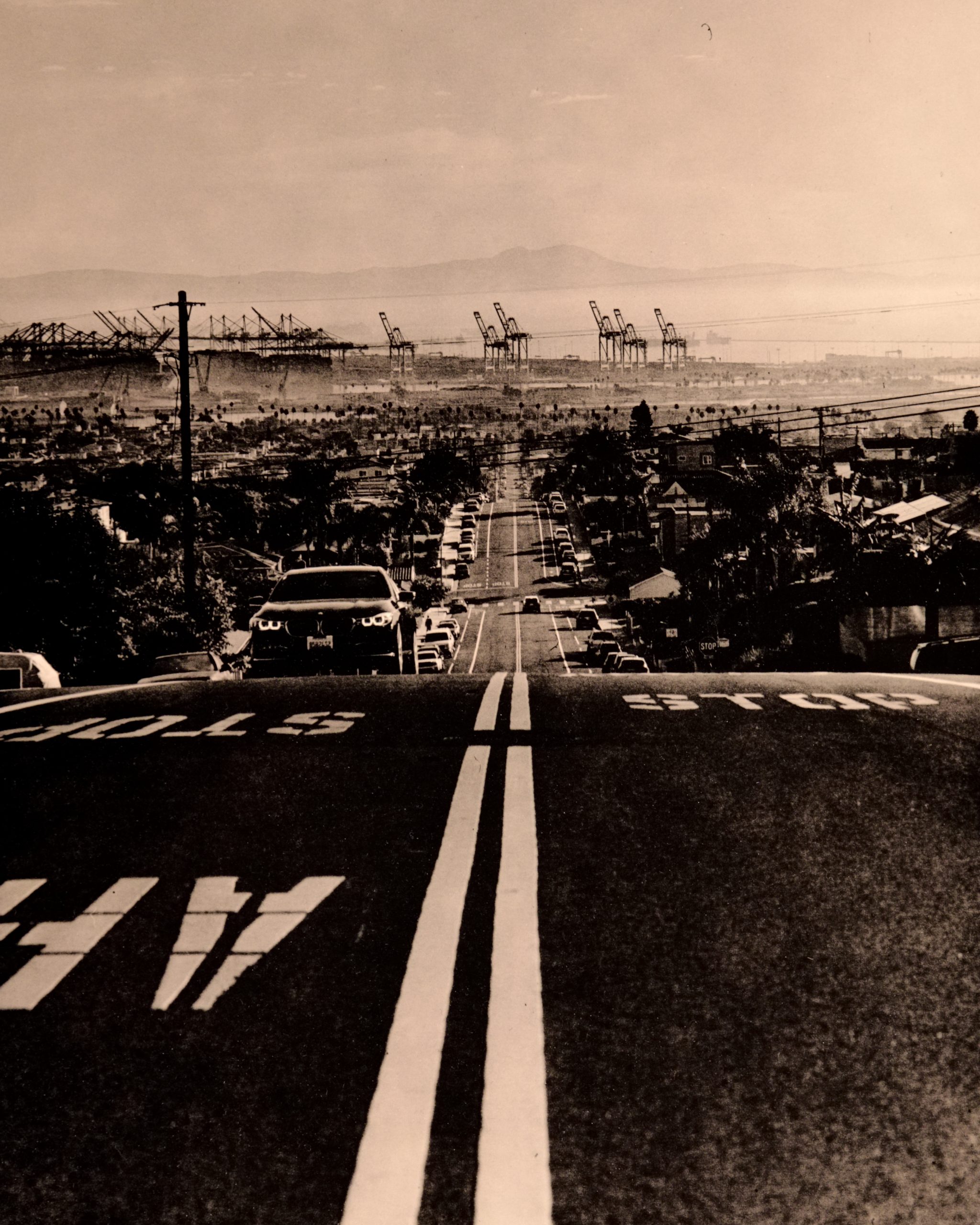 C&I: Back to L.A., and specifically your current neighborhood—San Pedro. That shot in your latest series, American Redux, with its undulating road and giant cranes of the port in the distance, somehow captures the vividness of a sunset—in a blackand-white photograph.