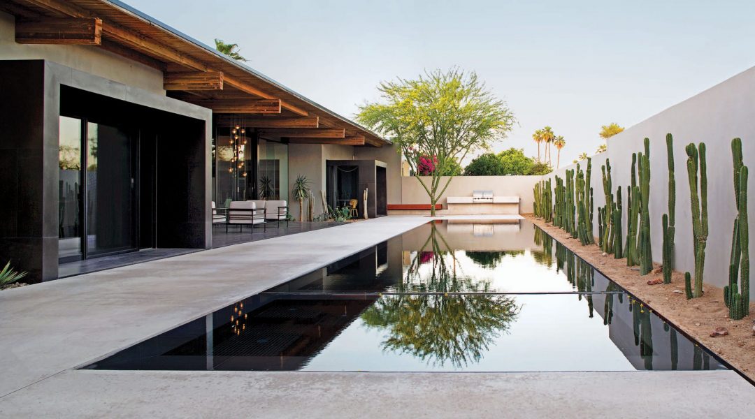 Scottsdale, Arizona, and its parched desert earth present the backdrop for sculpted gardens and large cactuses. Small in size, the private outdoor courtyard connects to a fully renovated 1970s-era patio home. The owner, who entertains frequently, wanted the exterior space to connect seamlessly with the interior in terms of both flow and design. Imperative to the project was his desire for a pool.