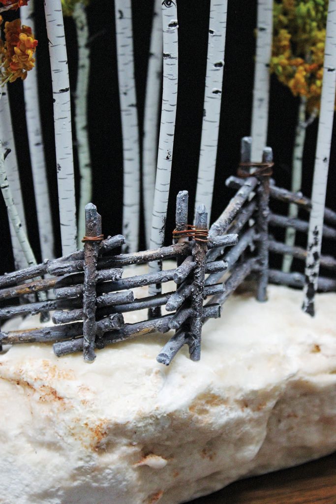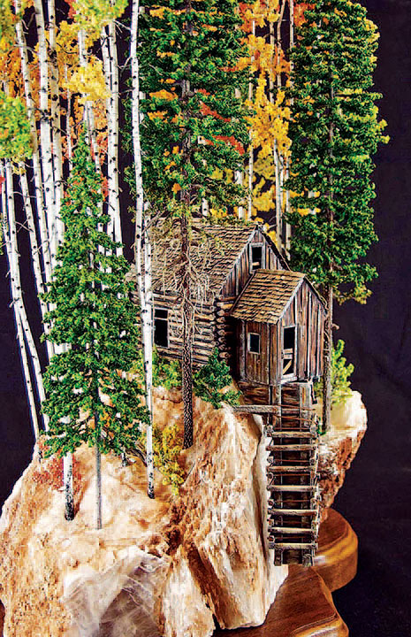 That bit of serendipity set DeMott on a path of creating his own original sculptures — in the early days, everything from airplanes to sunken pirate ships to carousel horses. These days, his custom sculptures tend toward Western rustic: old freight wagons, zigzag or split rail fences, wagon wheels, old mine remnants, and Indian tepees. Whatever he’s creating, though, the piece will include his signature aspen trees.