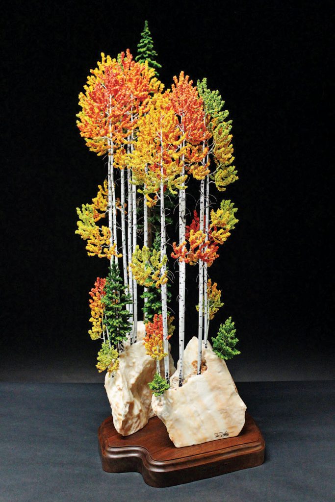 “The stark white trunks with the black eyes and their vivid fall colors. The way the leaves quake or shimmer in the breeze. The way they grow in groves by the thousands in high altitude with the majestic Rocky Mountains as the backdrop. When collectors call me about my work, it’s usually the first thing they bring up — how my sculptures take them back to Colorado, where they have such fond memories of how striking the aspens were in the fall, whether they were just driving through, on vacation, or have a second home here. If you have ever flown over the Rockies in the fall, it looks like the mountains are on fire with no smoke.”