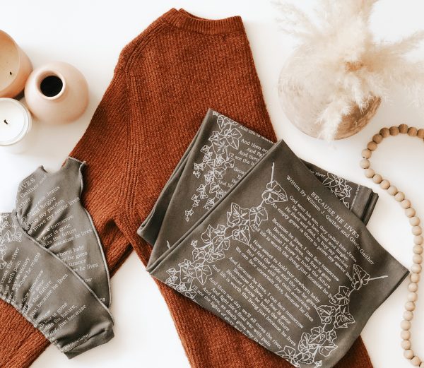 “Because He Lives” and other hymn-themed items include sherpa blankets, gloves, scarves, and totes. Gaither Music Group and Primary...